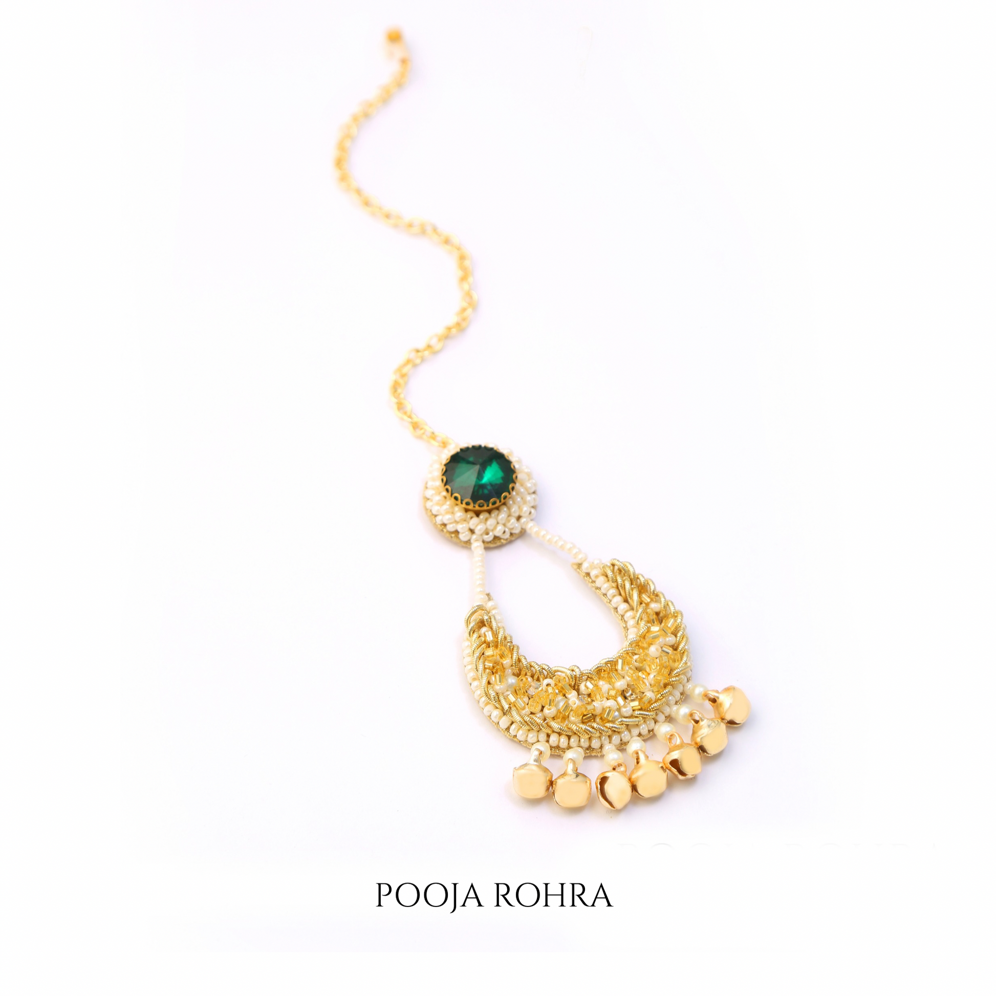 Our celestial inspired moon-shaped maangtikka, is a perfect blend of traditional Indian artistry and modern design. Handcrafted with glass beads, emerald stone, delicate pearls, and ghungroos, it captures the mystique of the moonlight, with a touch of royalty and elegance adding rhythm, sparkle, and charm to your bridal or festivities.