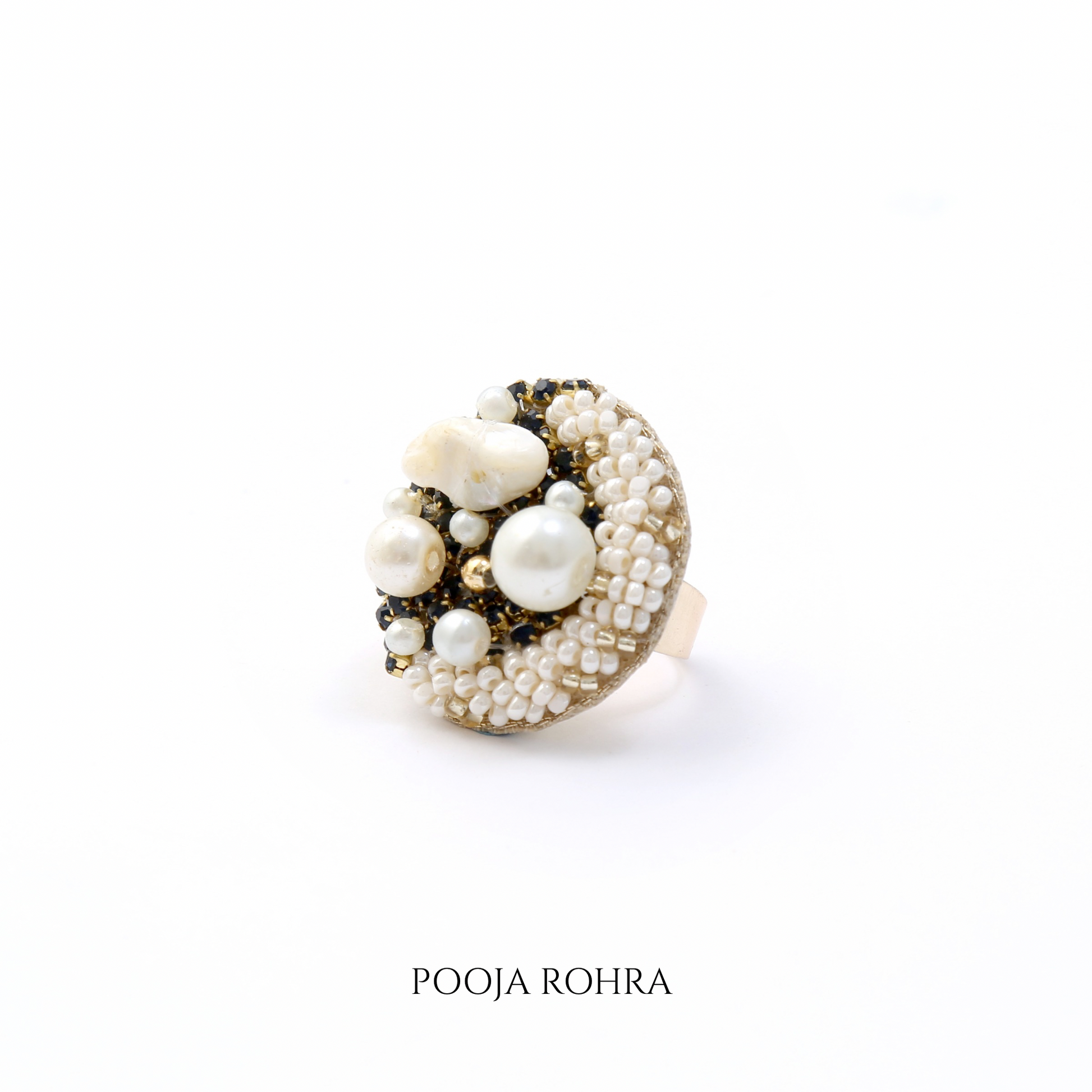 This handcrafted statement ring embodies the tranquil meeting of sea and sky. The Mother of Pearl centre glows like moonlight on water, while the metallic embroidery and glass detailing add a luminous, contemporary touch.