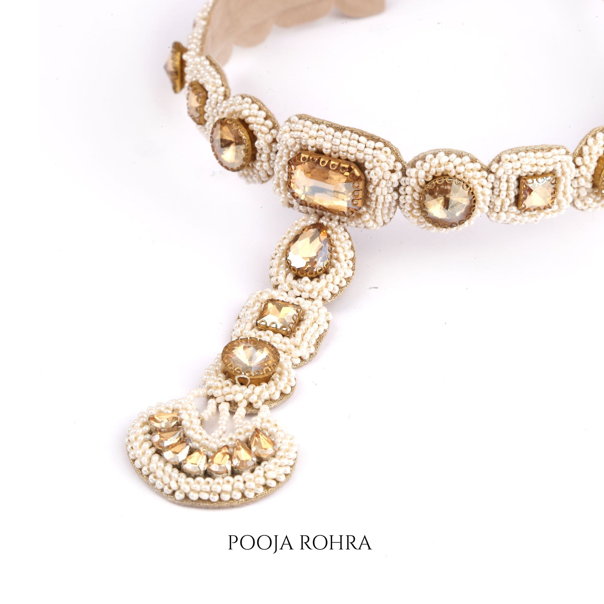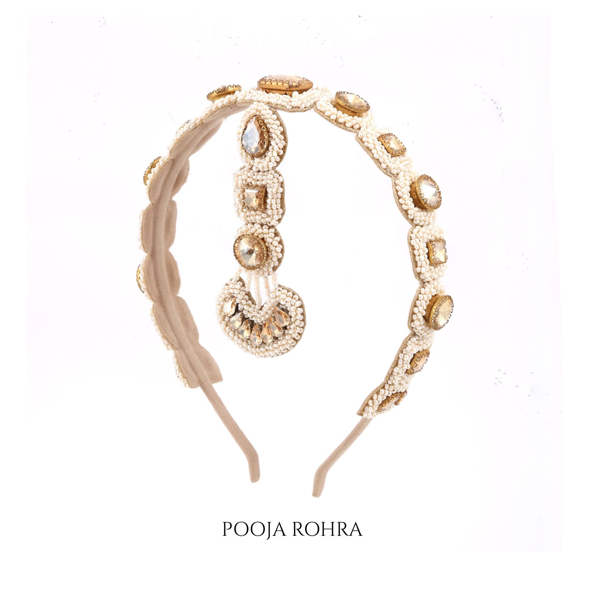 Designed for the modern muse, this handcrafted stone-beaded headband with an attached maangtikka radiates timeless beauty. Each premium glass stone is surrounded by delicate beads, forming a refined pattern that sparkles with understated grace. Each element is thoughtfully arranged in intricate shapes to create a stunning, symmetrical pattern. The attached maangtikka design ensures ease of styling, offering a graceful, well-balanced look without the hassle of multiple accessories. Crafted on soft vegan-leather backing, it’s gentle on the skin and comfortable for long hours, it's a perfect statement for weddings and modern fusion looks.