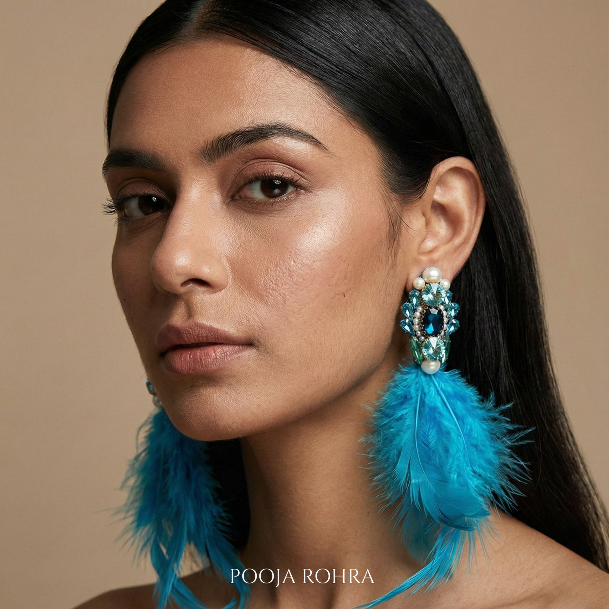 These handcrafted earrings featuring turquoise stones and delicate feathers are thoughtfully designed with Indian artisanal craftsmanship, making it a statement accessory for contemporary Indian outfits. The turquoise stones bring a soothing, royal touch, while the feathered drops add playful rhythm and effortless charm. Handcrafted with glass stones, delicate pearls, metallic threadwork, and a vegan-leather backing, these earrings are lightweight, comfortable, and designed to elevate both traditional and modern looks. Perfect for bridal mehendi, sangeet, festive parties, or casual celebrations, these earrings celebrate nature-inspired beauty and modern Indian luxury.