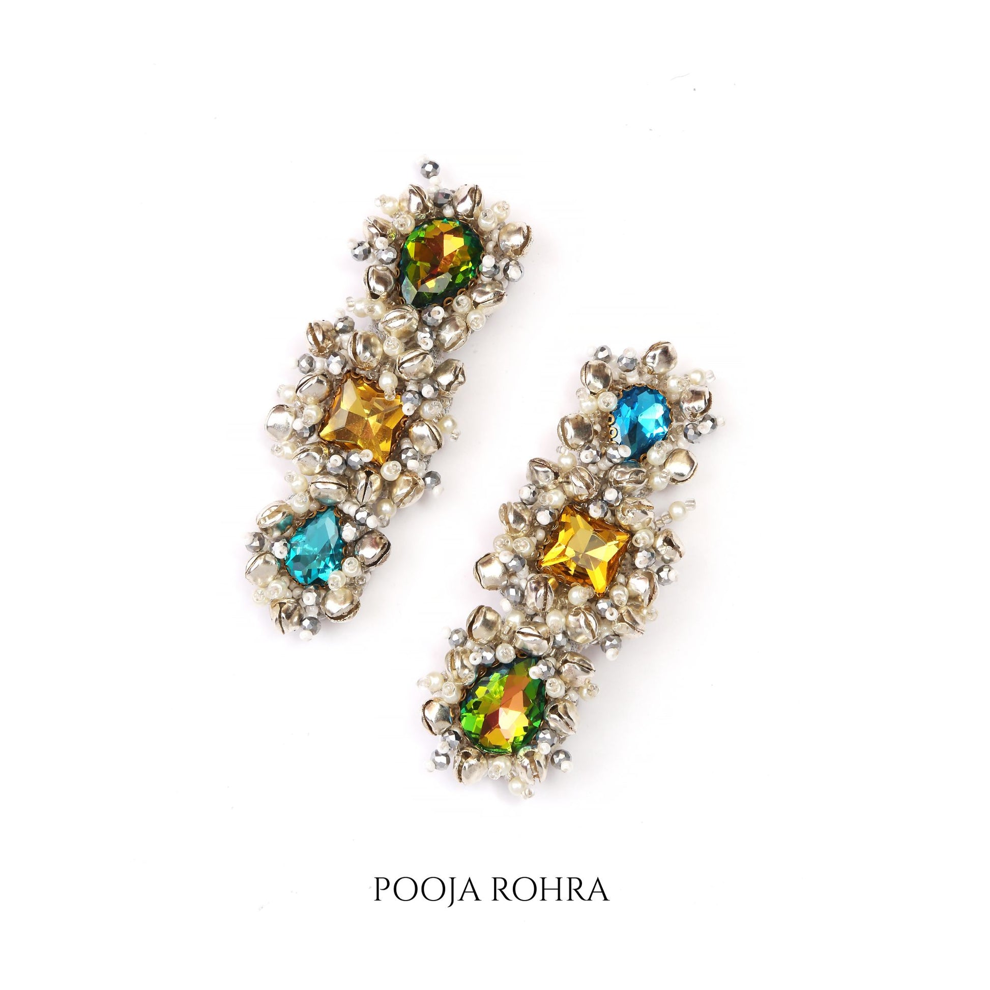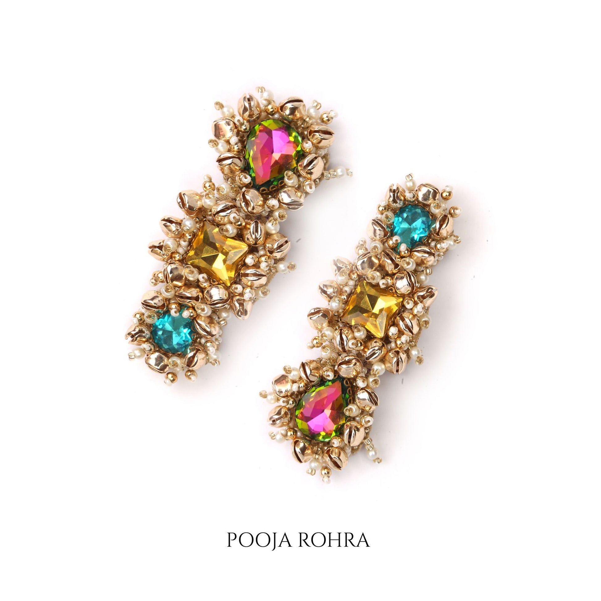 Inspired by the rhythm and charm of Indian traditions, these handcrafted Ghungroo Hairclips bring a perfect blend of heritage and modern sophistication. Handrcafted with three-tier glass stones inspired by sky, water & nature and delicate ghungroo detailing, adding movement, melody, and elegance to your hairstyle. Whether you’re styling your hair for a wedding, mehendi, haldi, or festive soirée, these clips complement everything from sarees and lehengas to fusion and contemporary outfits. Lightweight yet striking, they make a statement that’s rooted in culture and crafted for modern-day glamour.