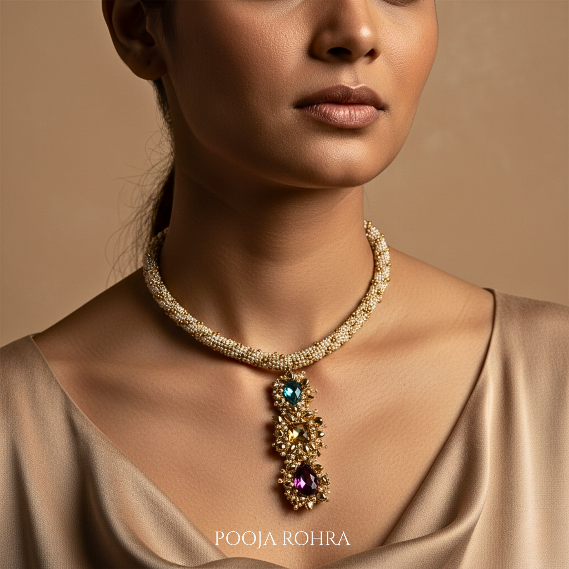This handcrafted statement choker draws inspiration from sky, water, and nature. Basra-pearls like beadwork in the base with a three tier central pendant stone with ghungroo detailing adds rhythm and festive charm. Blending Indian craftsmanship and heritage artistry with modern spohistication makes this choker necklace a perfect fit for bridal looks, festive celebrations, and luxury soirees. It elevates both traditional Indian and contemporary couture - from sarees and lehengas to off-shoulder gowns and structured blazers.